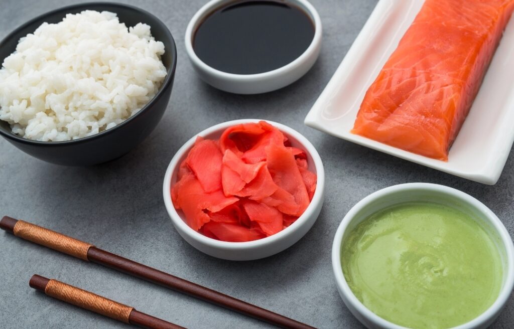 • Pesce o ingredienti di riempimento: Scegliete i vostri ingredienti preferiti per il ripieno degli Uramaki, come pesce crudo o cotto, verdure, formaggi o altri accompagnamenti. Tagliate gli ingredienti in strisce sottili o bastoncini per facilitarne l’inserimento nel rotolo.